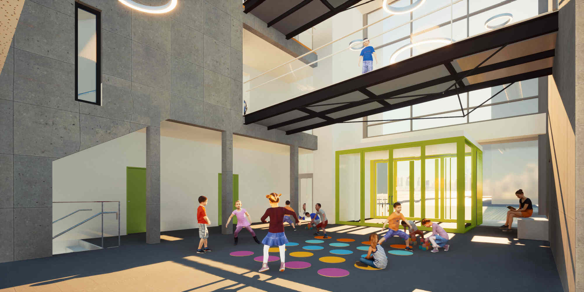 Die Neubauteile werden als Hybridkonstruktion entstehen, d. h. als Stahlbeton-Skelettkonstruktion mit vorgehängter Fassade in Holzrahmenbauweise. Das durch unser Büro erstellte Brandschutzkonzept berücksichtigt die Möglichkeiten der neuen Schulbaurichtlinie des Landes NRW. Im Projekt werden Lernräume in Form von Lernclustern umgesetzt.