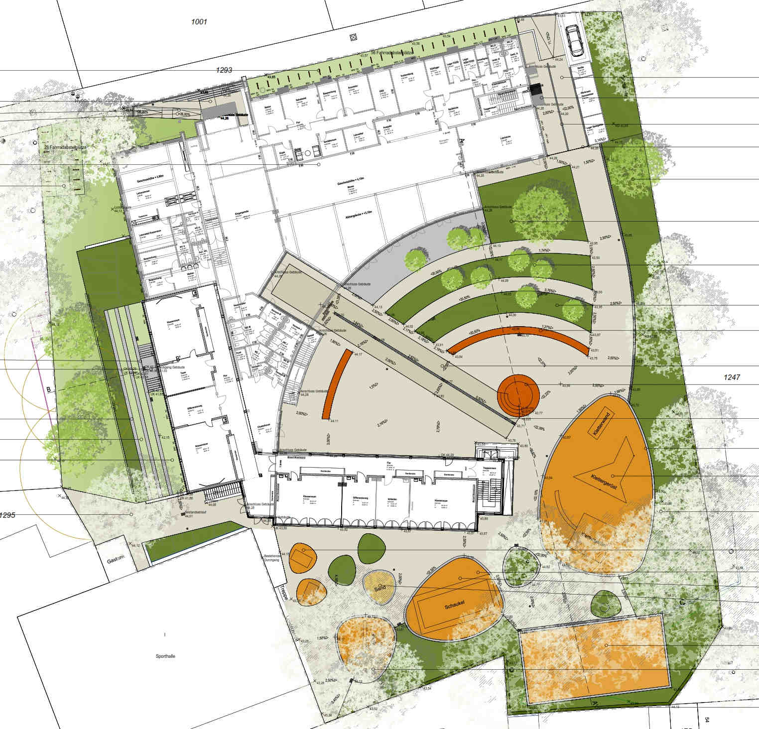 Aufgabenstellung ist die Erweiterung der Schule auf insgesamt 4 Züge bei laufendem Betrieb des Bestandes. Da Teile des Bestandes nicht weiter erhaltenswert sind, mussten Interimslösungen in Form von Klassencontainern für einen Teil der Räume für die Bauzeit geplant und umgesetzt werden. Diese Raummodule sind bereits in Betrieb, die altbauteile werden derzeit entkernt und in der Folge abgerissen, der Neubau beginnt mit Spezialgründungsmaßnahmen im ersten Quartal 2022.