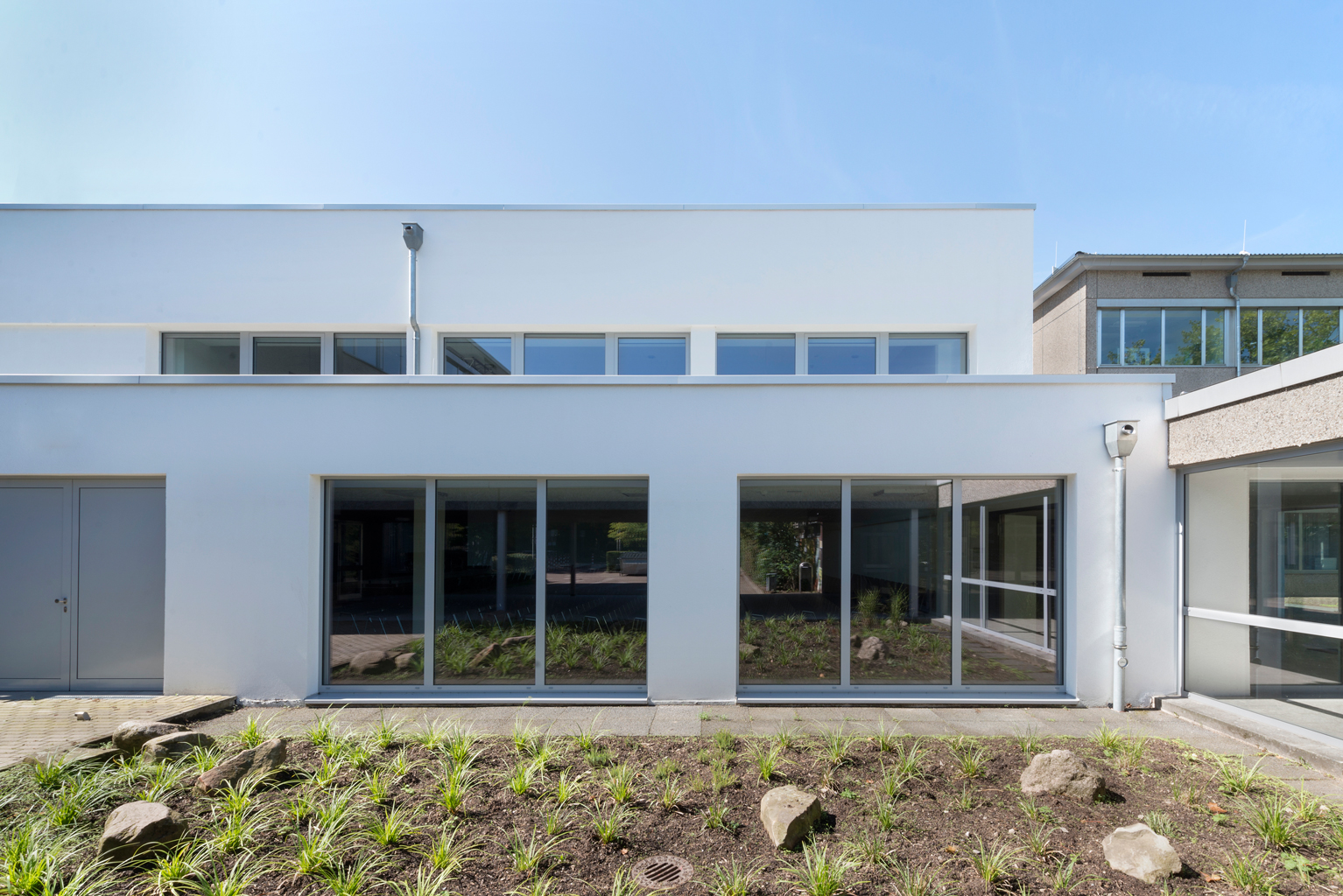 Die Aula aus dem Jahr 1976 wies deutliche Bauschäden auf. Weiterhin entsprach sie nicht den Anforderungen des Brandschutzes und die technischen Anlagen waren angängig.