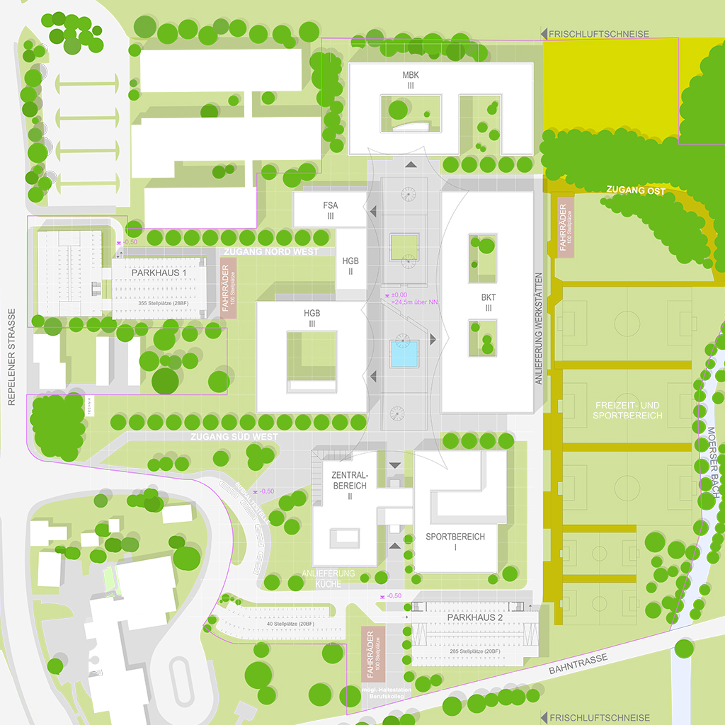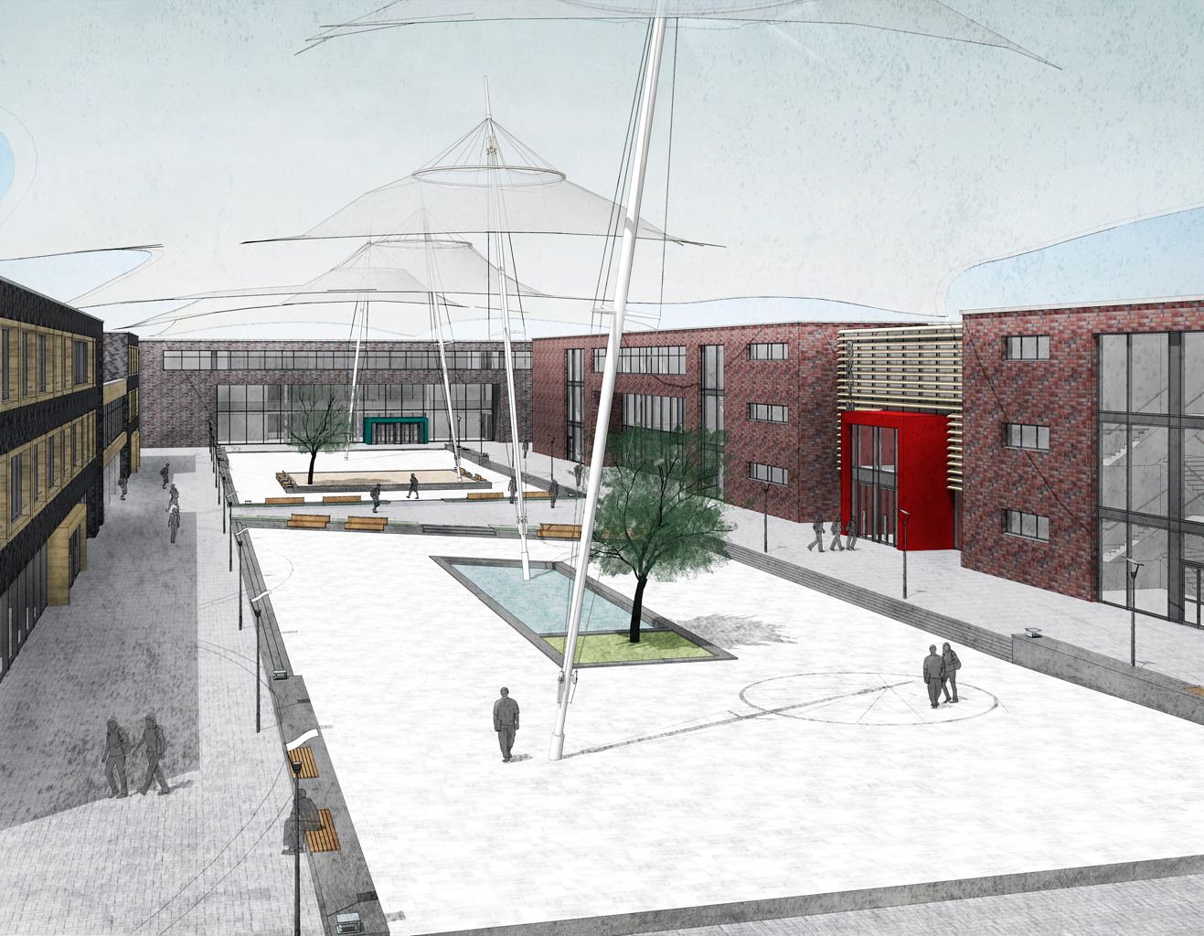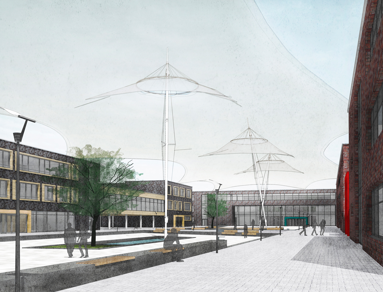 Der Entwurf sieht die Gruppierung der Einrichtungen, inklusive der gemeinsam genutzten Sporthalle und Mensa, um einen zentralen Platz vor. So bildet sich ein neuer Campus als „Insel der Bildung“.