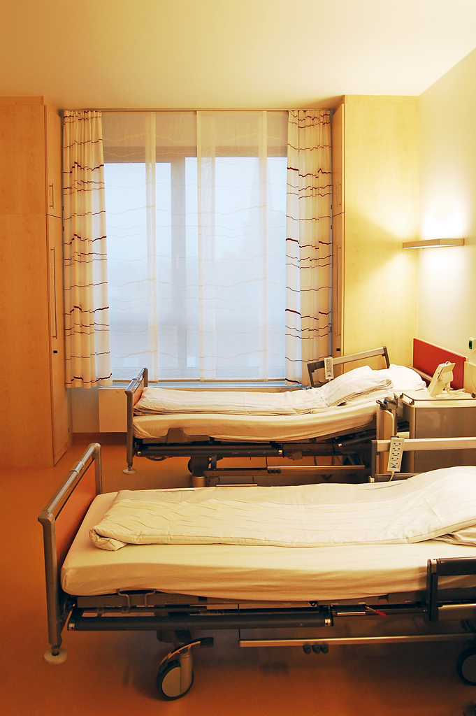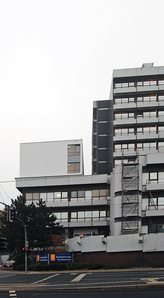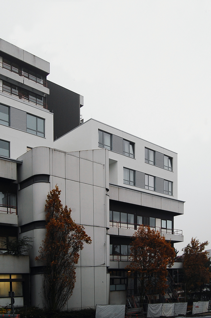 Die zentrale Umstrukturierungsmaßnahme mit Erweiterung des Hauptgebäudes macht die zusätzliche Errichtung von Bettenzimmern auf dem vorhanden Breitfuß erforderlich. Um während der Baumaßnahmen die Gesamtbettenkapazität nicht zu reduzieren muß diese Aufstockung vor der Umsetzung der Hauptmaßnahme realisiert werden. Entsprechend der besonderen baulichen Anforderungen (Tragfähigkeit des Breitfußes etc.) und der kurzen Vorlaufzeit bietet sich hierzu die Errichtung in einer vorgefertigten Modulbauweise an. Nach intensiver Abstimmung der Details ist es gelungen eine wirtschaftlich, funktional und gestalterisch hochwertige Lösung zu entwickeln, die auch in den nächsten Jahrzehnten den Anforderungen gerecht werden wird. Insgesamt werden 71 Betten verteilt auf zwei Geschosse errichtet. Die Anbindung und Erschließung kann über vorhandene Aufzugsanlagen und Anbindung an bestehende Treppenhäuser erfolgen.