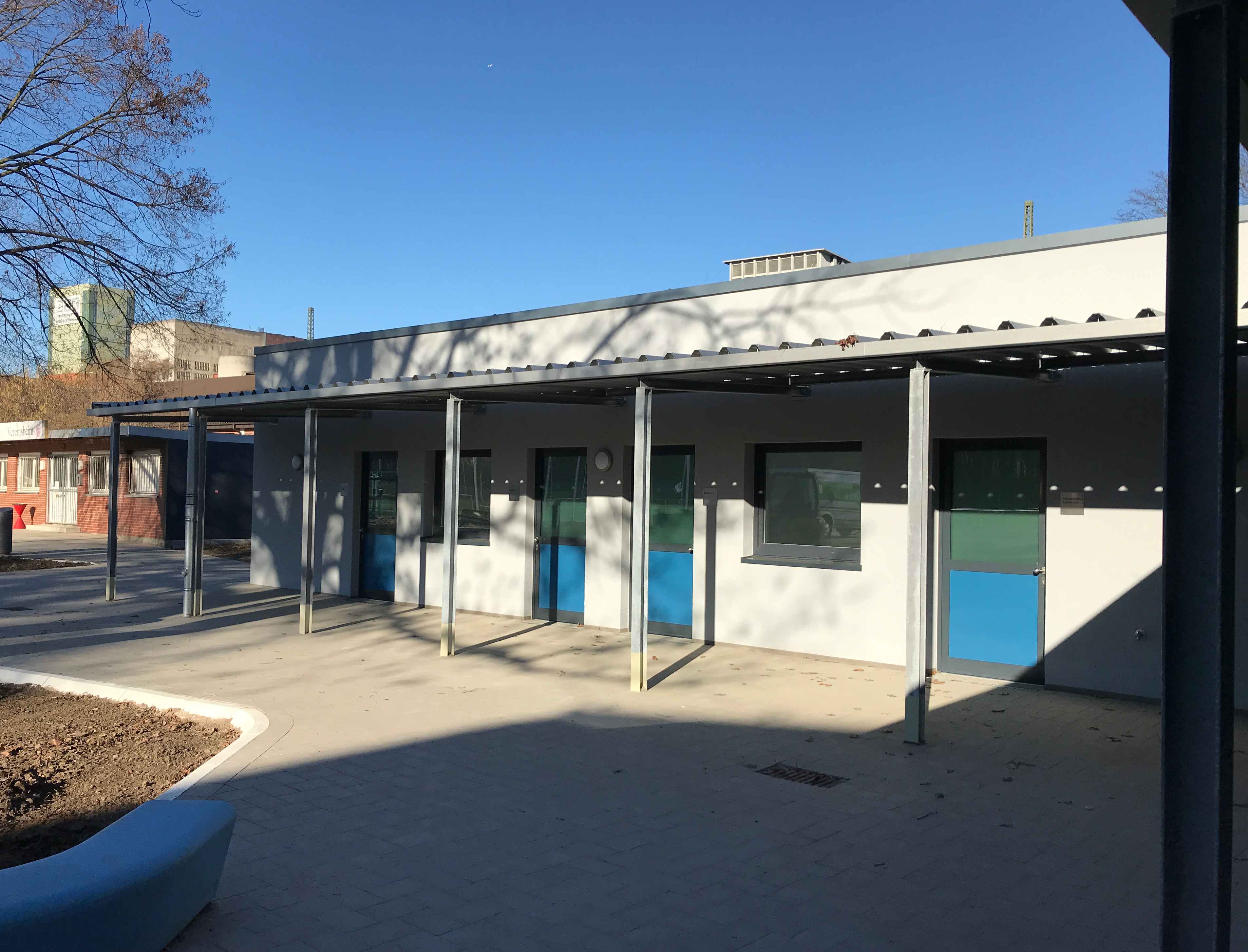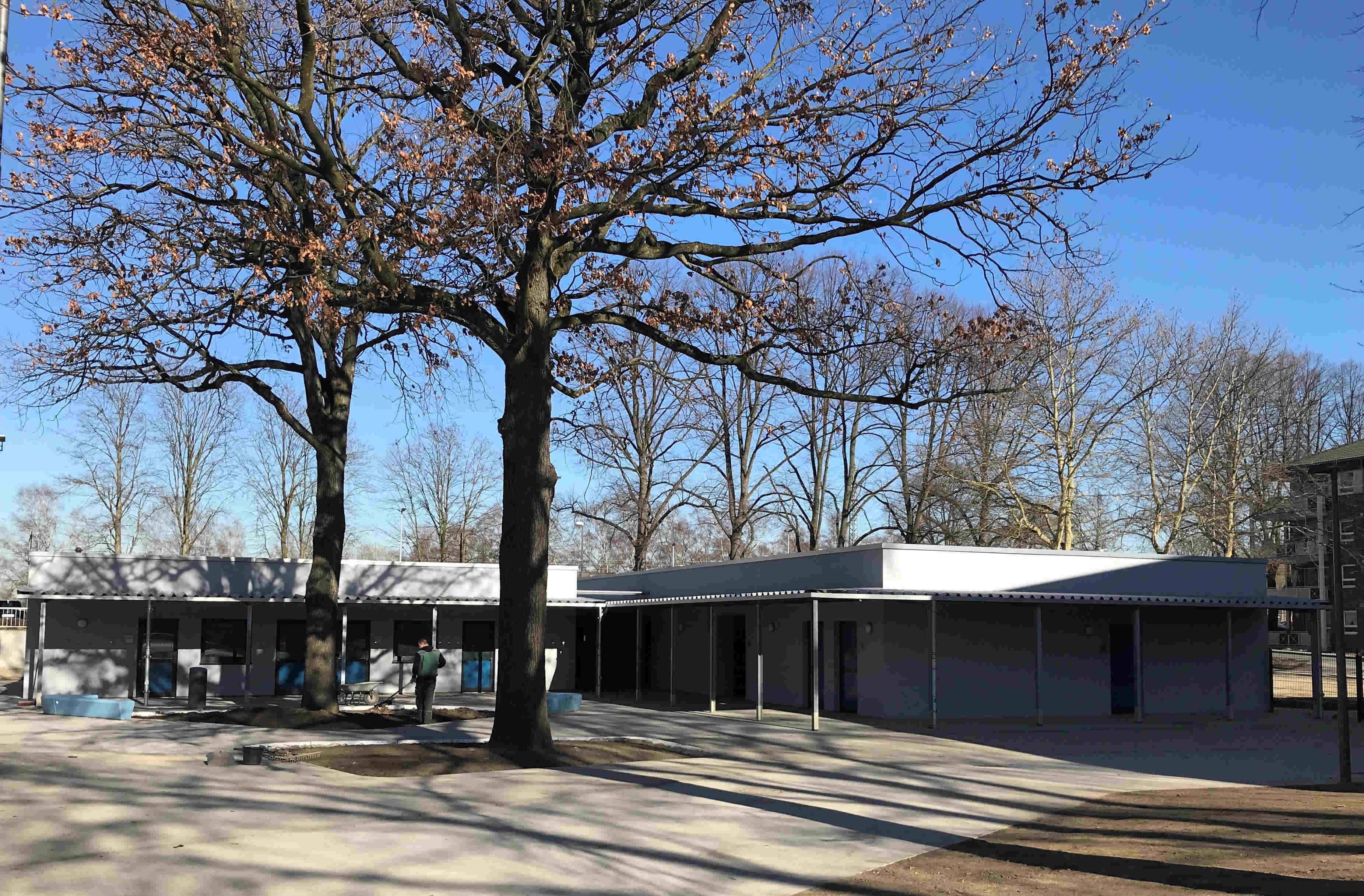 Im Zuge der Maßnahme wir das Umkleide- und Platzwartgebäude neu errichtet und die West-Fassade der Turnhalle energetisch saniert.