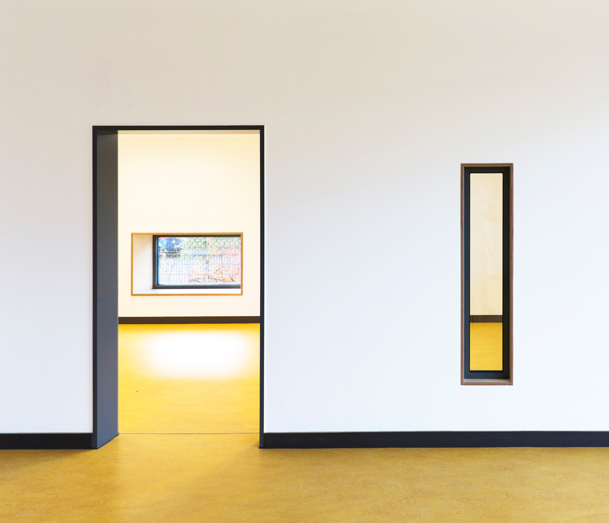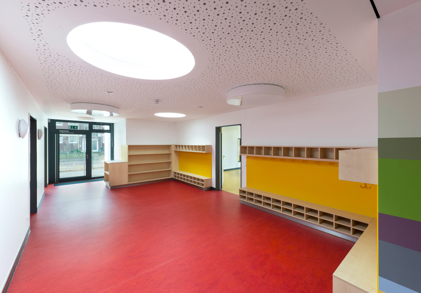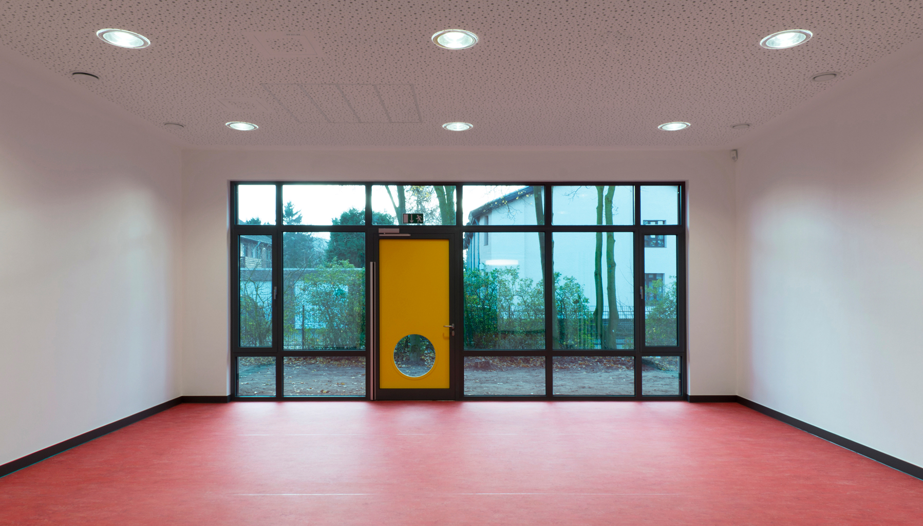 Der vorliegende Entwurf ermöglicht einen Ersatzneubau auf gleichem Grundstück bei bestehendem Betrieb des alten Kindergartens. Das Gebäude ist in einen allgemeinen Bereich mit Mehrzweckraum und einen Gruppenbereich mit den beiden Gruppen-, Gruppenneben- und Schlafräumen gegliedert. Die Anordnung der Gruppen im Gebäude ermöglicht eine klare Zonierung zur besseren Orientierung der Kinder.