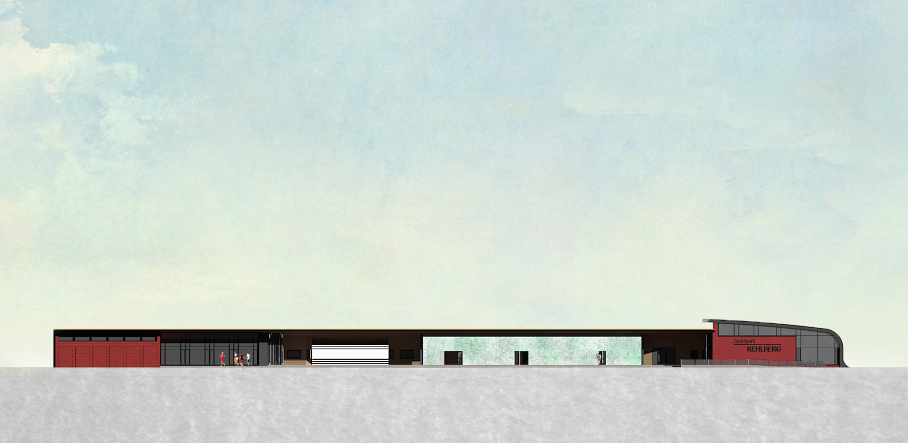 Aufgabenstellung war neben der Neugestaltung der Freianlagen die Entwicklung eines neuen Umkleide- und Gastronomiebereiches mit angegliederten Platzwarträumen sowie einer Platzwartwohnung. Entsprechend der exponierten Lage auf dem Rehlberg haben wir das neue Gebäude abweichend von der vorhandenen Situation an der Längsseite der Sportanlage positioniert. So wird bei gleichzeitigem Ausblick über Georgsmarienhütte ein Schirm zur angrenzenden Wohnbebauung gebildet. Aus der Lage des Gebäudes ergibt sich die Möglichkeit, durch eine geringfügige Höherlegung eine enfache Zuschauertribüne zu gewinnen.