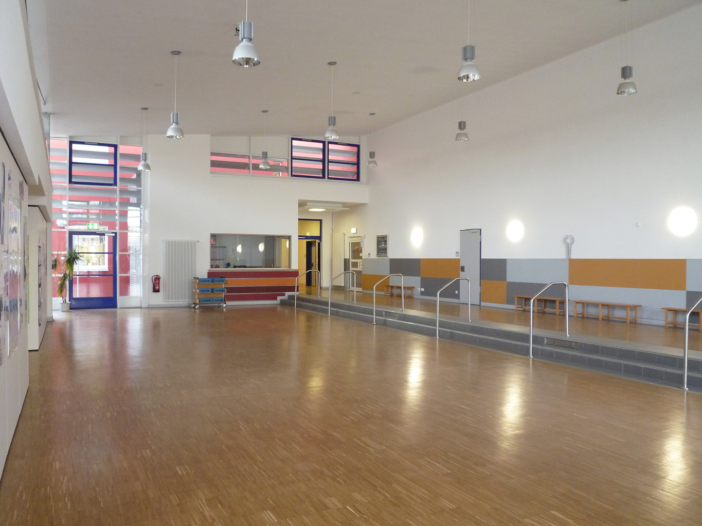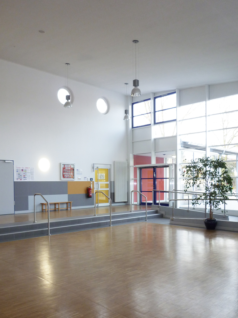 Der Entwurf sieht vor, die vorhandene Achse des offen Ganztages aufzunehmen und am Ende durch einen neuen Haupteingang abzuschließen. Im direkten Anschluß an das Bestandsgebäude wird der Neubau zweigeschossig errichtet, der weitere Bereich wird eingeschossig ausgeführt. Im Knotenpunkt liegt die neue Eingangshalle, die zugleich auch Veranstaltungsraum für die Schulen ist.